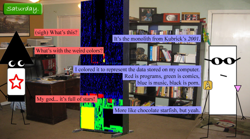 I think the second panel could have also worked if I'd stopped with "polishing my monolith", but whatever. If you don't get the "full of stars" punchline, look at this YouTube clip, this Wikipedia entry , and then follow-up with this Urban Dictionary entry.